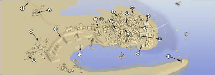 Het centrale deel van de stad is niet heel groot en meet 300 bij 350 meter. In de wijde omtrek van deze centrale stad zijn sporen van menselijke activiteiten aangetroffen. Zo ligt er ten zuiden van de stad een gebied waar metaalbewerking plaatsvond. In het midden van de stad, op het hoogste gedeelte, was de tempel gesitueerd, gewijd aan de god Serapis. Daaromheen lag een gordel met woonhuizen, kleine winkels en werkplaatsen. Aan de oostrand van de stad zijn vooral resten van grote gebouwen aangetroffen; mogelijk administratieve gebouwen, opslagruimten en scheepswerkplaatsen.